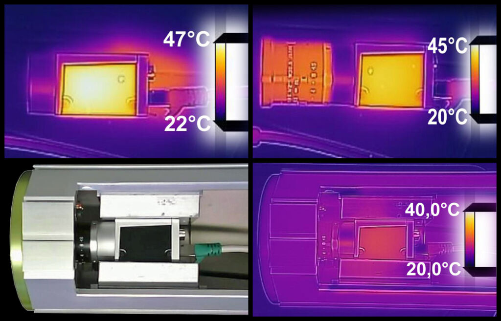 Bild 2 | Die Temperatur der Kamera (o.l.) sinkt etwas bei Montage eines Objektivs (o.r.) und besonders stark bei effektiver thermischer Kopplung mit einem Schutzgehäuse wie dem Orca (u.)Bild: autoVimation GmbH