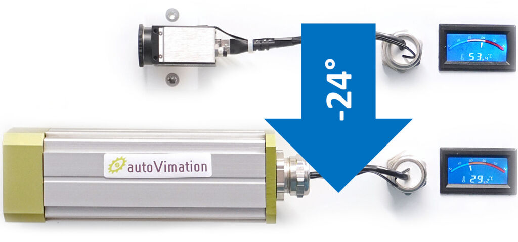 Dementsprechend bestimmen die meisten Betriebsanleitungen, dass die Kameras nicht ohne Montage an Kühlkörpern betrieben werden sollen. Auch große Objektive helfen der passiven Kühlung der Kamera, da sie das von der Luft umgebene Gesamtvolumen der Kameraeinheit vergrößern. Ein effizienter Ansatz zur passiven Kühlung ist der Einbau in geeignete Kameraschutzgehäuse. So nutzen die Schutzgehäuse von AutoVimation durch die patentierte Quick-Lock/Heat-Guide-Kamerabefestigung das komplette Außengehäuse als Kühlkörper. Die Gehäuseoberfläche ist um ein Vielfaches größer als die der Kamera. Das sorgt für einen sehr effizienten Temperaturausgleich, sodass die Kamera in der Regel nur noch 5°K wärmer ist als die Umgebungsluft. Die Abwärme wird über große Auflageflächen schnell an das Gehäuse abgeführt und die Kamera um bis zu 25°K gekühlt. Das ermöglicht Bildverarbeitungsanwendungen bei höheren Umgebungstemperaturen, z.B. 45 statt 20°C – ohne zusätzliche Kühlung. Oberhalb von 45°C genügt passive Kühlung in der Regel nicht. AutoVimation bietet für den Kameraeinsatz bei extremeren Temperaturen drei Hauptlösungen an: eine Peltier-Kühlung für bis zu 70°C Umgebungstemperatur (oder etwas niedriger bei hoher Sonneneinstrahlung), Wasserkühlung für -40 bis 200°C sowie eine geregelte Heizplatte für -40 bis 45°C.