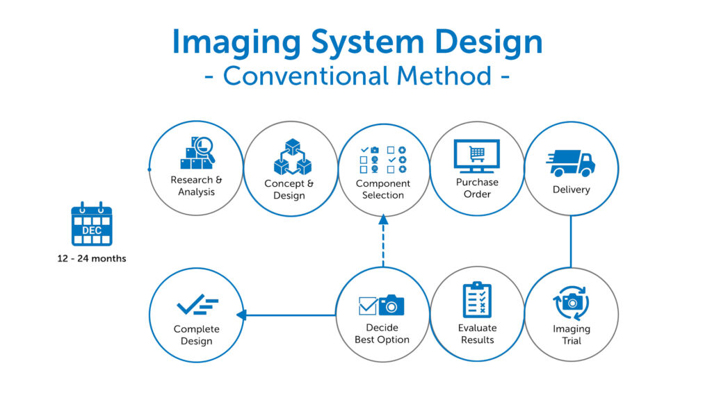• Prüfung, Bewertung & Entscheidung: Das System muss kosteneffizient und zuverlässig sein und einen Produktlebenszyklus von mehr als zehn Jahren überdauern. Gründliche Tests und Evaluierungen sind erforderlich, um ein Bildverarbeitungssystem zu entwickeln, das diese Eigenschaften beibehält. Während dieses Prozesses führen alle erforderlichen Änderungen an den Komponenten zu einem komplett neuen Zyklus der Komponentenauswahl und -prüfung, was die Gesamtkosten des Systems noch einmal erhöht.