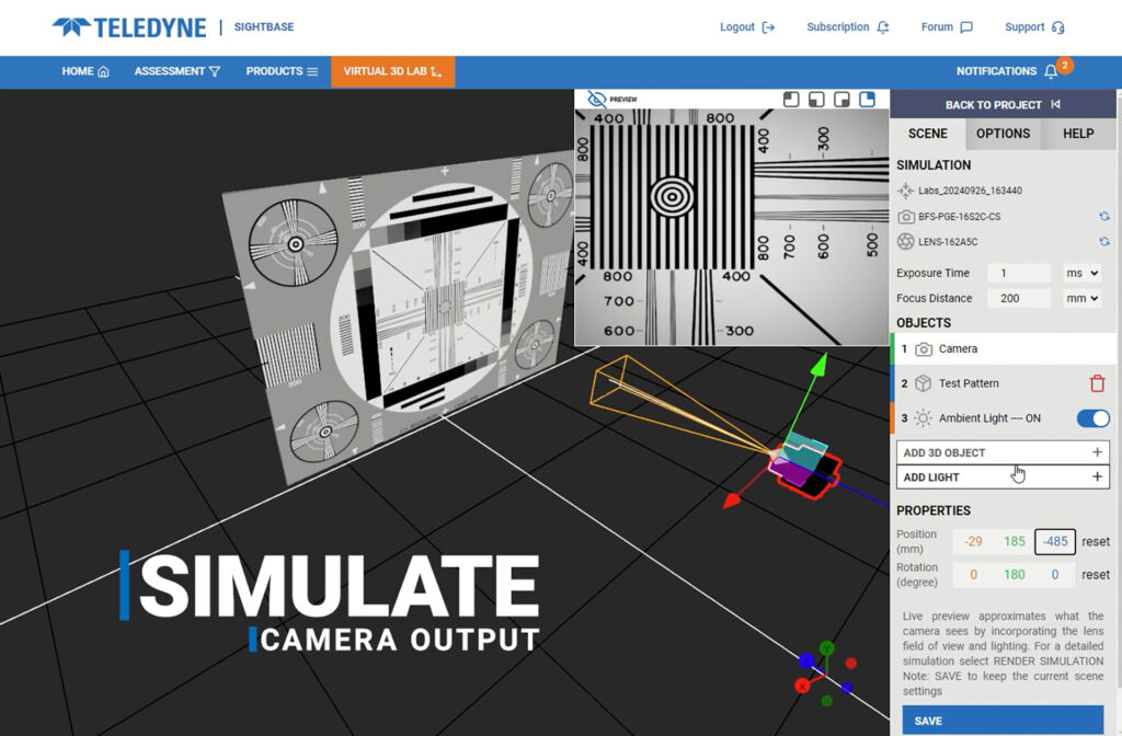 SightBase ist eine Cloud-basierte SaaS-Plattform (Software-as-a-Service), die die Design-In-Zyklen beschleunigen. Design- und Entwicklungsteams für Bildverarbeitungssysteme sind die Hauptnutzer der neuen Plattform. Die Software simuliert eine Konfiguration für die Bildverarbeitung auf Grundlage der Anwendungs- und Umgebungsanforderungen. Der Systementwickler kann dann z.B. eine Kombination von Komponenten wie Kameras, Objektive, Beleuchtung usw. auswählen und die Bildergebnisse für die gewünschten Systemaufgaben testen. Die repräsentativen Bilder werden mit physikbasierter Simulationstechnik in einem virtuellen 3D-Labor erstellt. Fortgeschrittene Benutzer können 3D-Szenen im virtuellen Raum zur sofortigen Visualisierung von Objekten konfigurieren, indem sie Kamera, Objektiv und Beleuchtung in Echtzeit anordnen und positionieren. Zusätzlich führt ein interaktives Assessment-Tool das Team durch die Auswahl der Komponenten und Empfehlungen. Es stellt eine Reihe von Leitfragen zu den Bildverarbeitungsanforderungen und gibt Empfehlungen zu Kamera, Objektiv und Beleuchtung.