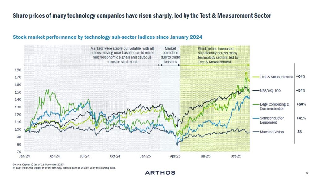 Der neue Bericht ‚Industry Insights: Test & Measurement‘ von Arthos zeigt, dass nach der allgemeinen Erholung des Aktienmarktes in den letzten Monaten insbesondere die Aktienkurse von Technologieunternehmen stark gestiegen sind, wie aus dem Indexvergleich auf Seite 6 hervorgeht. Nur Machine Vision verzeichnet einen Rückgang von -3%.