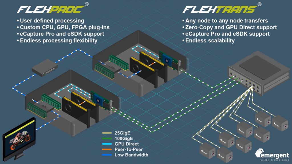 ECapture Pro ist eine Software für die Integration von Emergent Visions 10/25/100 GigE-Kameras. Die Funktion FlexProc ermöglicht die Verarbeitung von Bilddaten und Ergebnissen im System, z.B. auf CPUs, GPUs oder in der Cloud. FlexTrans erlaubt die Verschiebung von Bilddaten und Ergebnissen zwischen GPUs, Servern oder dem System und der Cloud.