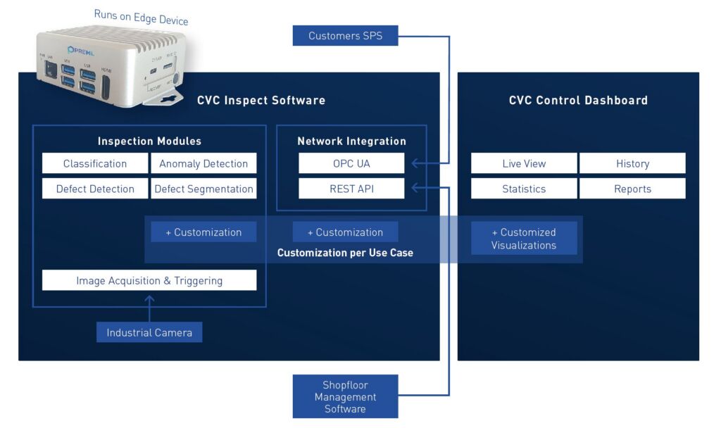 Naturally, the framework contains a lot of different AI based modules as well, such as supervised or unsupervised models, which can easily be exchanged based on a projects requirements. Further, as the framework is python based, we can include the newest state-of-the-art networks effortlessly. One key benefit is, that since the software was fully developed in house and only depends on open source libraries, preML can offer a wide range of licensing options, making sure that machine vision integrators, producing companies and software manufacturers can profit from CVC.