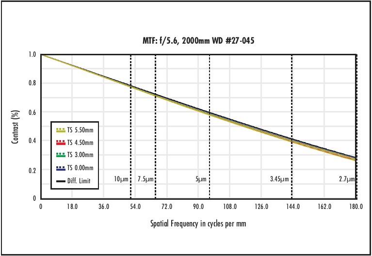 —To better understand the performance capabilities of the E-Series lenses, it’s essential to highlight the concept of the diffraction limit. Central to this is the Airy disk, which represents the smallest point to which a beam of light can be focused through an imaging lens. The size of the Airy disk is dependent on the lens’s f/# as well as the wavelength of light used. The Airy disk is the diffraction pattern produced when light passes through a circular aperture, such as that found in an imaging lens. The radius of the central bright spot of this pattern, known as the Airy disk, partly determines the diffraction limit of the lens. This limit is the theoretical maximum resolving power of the lens, expressed in line pairs per millimetre (lp/mm), beyond which two Airy patterns are no longer distinguishable. While the diffraction limit sets the upper-performance boundary of a lens, real-world factors such as lens design limitations and manufacturing imperfections can further reduce the lens’s ability to produce the smallest achievable spot, thereby affecting resolution and contrast.