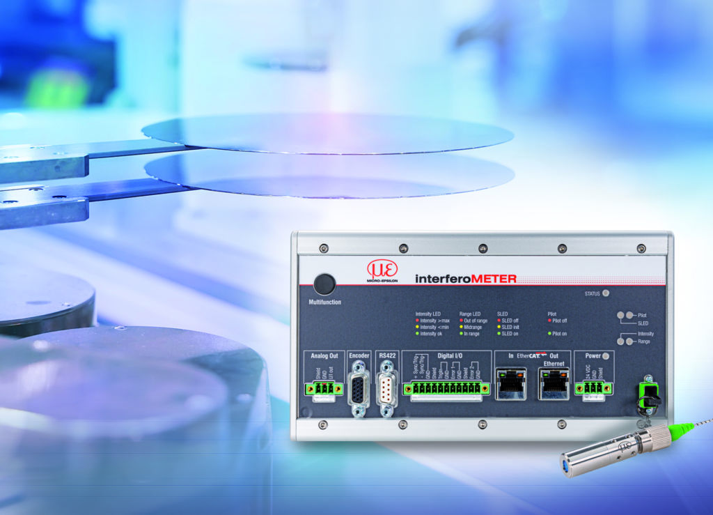 Bild 1 | Bei der Herstellung von Halbleiterwafern müssen Dicke und Oberflächenqualität nanometergenau sein. Die Wafer-Dickenmessung erfolgt daher mit Weißlichtinterferometern, die aus einem kompakten Sensor und einem Controller bestehen.Bild: Micro-Epsilon Messtechnik GmbH & Co. KG