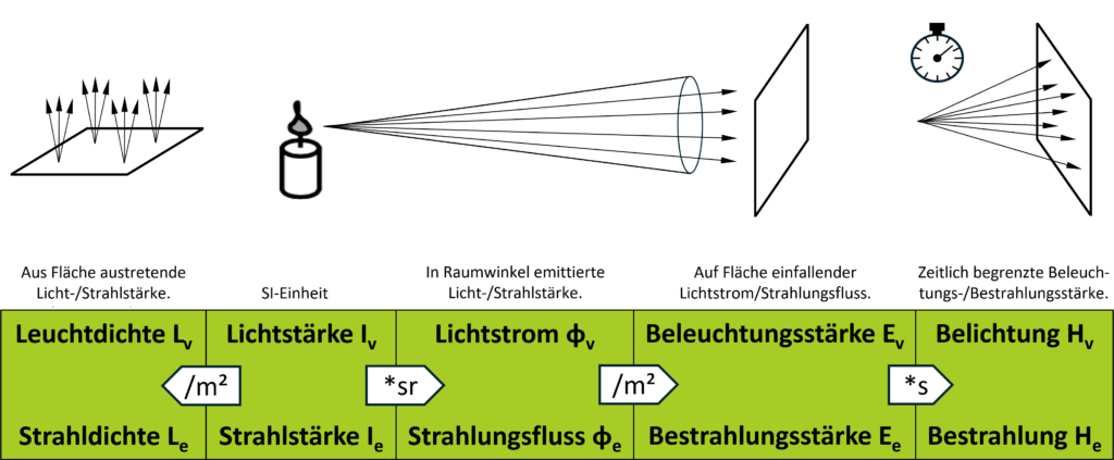 Index e: energetisch; Index v: visuell; sr: Steradiant (Maßeinheit Raumwinkel; eine Kugel hat den Raumwinkel 4?sr). – Bild: Evotron GmbH & Co. KG